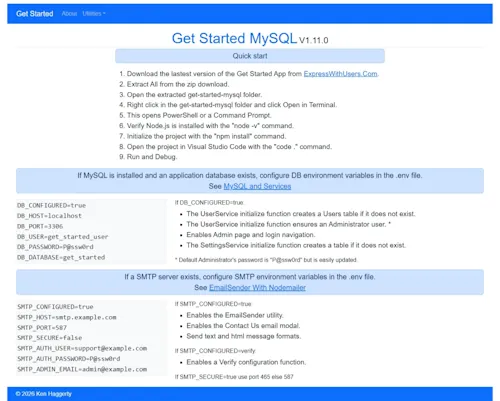 Registered members can download the FREE Get Started Apps. I initially implemented MySQL for this site and the Get Started App. The Get Started App is the project I used to compose articles about setting up VS Code and developing Node with Express and the Embedded JavaScript (EJS) view engine. I decided to migrate this site to PostgreSQL. Rather than replacing the MySQL Get Started App, I decided to add a PostgreSQL Get Started App. Both apps will run without a database but can integrate with either MySQL or PostgreSQL by configuring environment variables in the .env file.